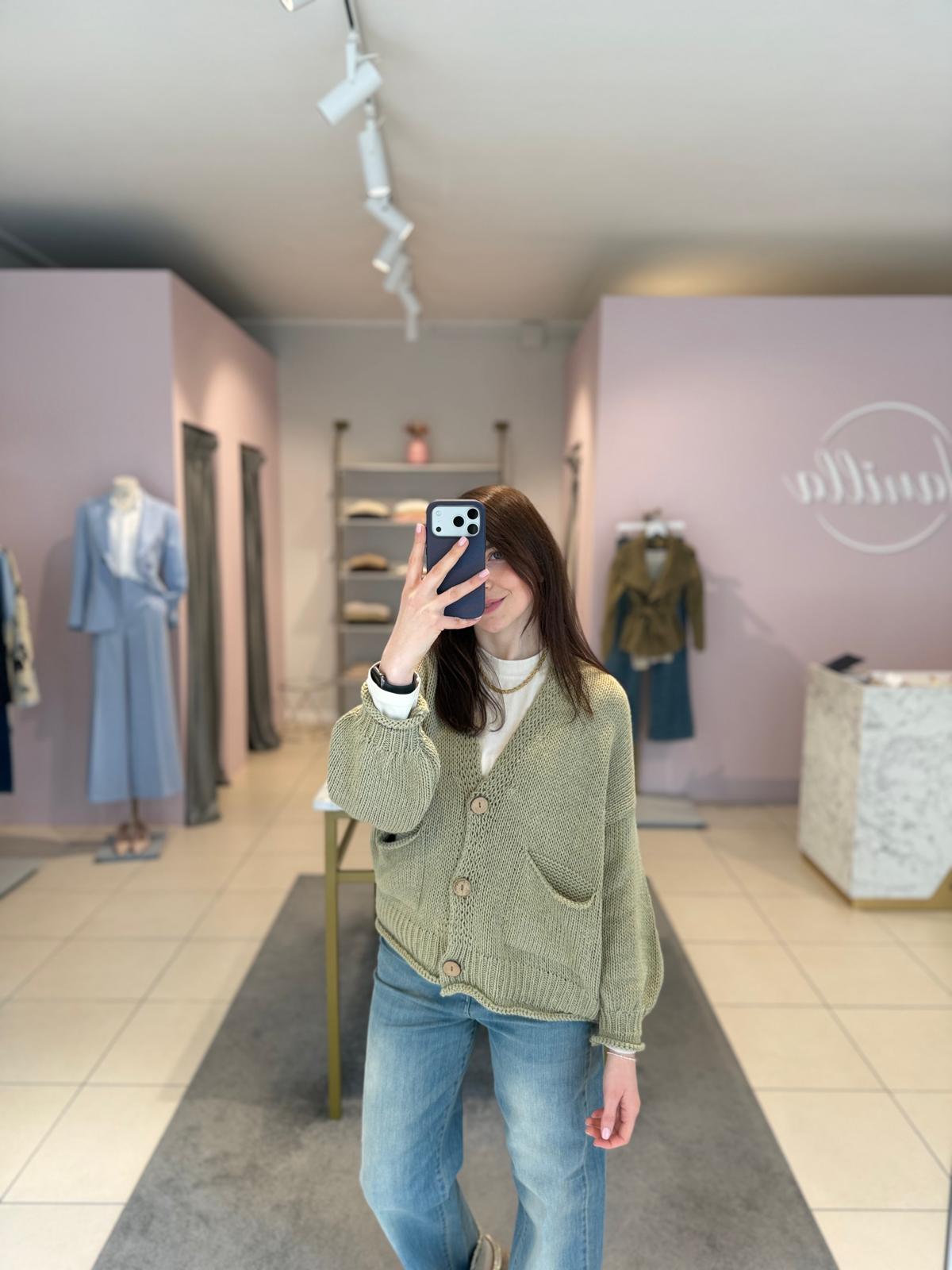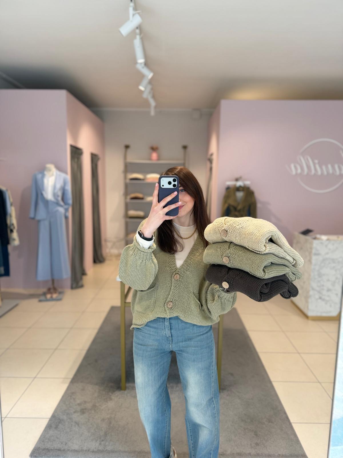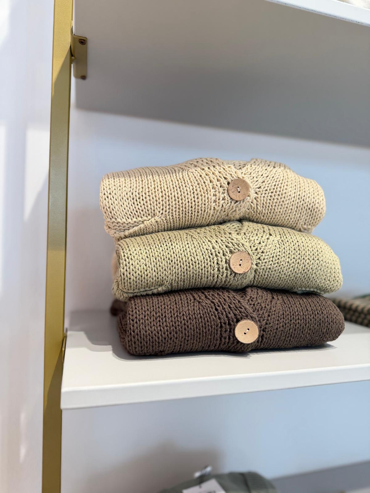 Cardigan in cotone con bottoni in legno e tasche frontali.