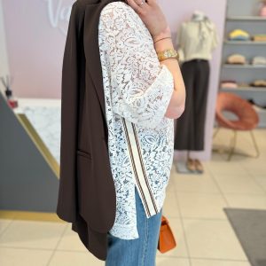 Blusa floreale con chiusura con laccetti al collo impreziosita da nappine.