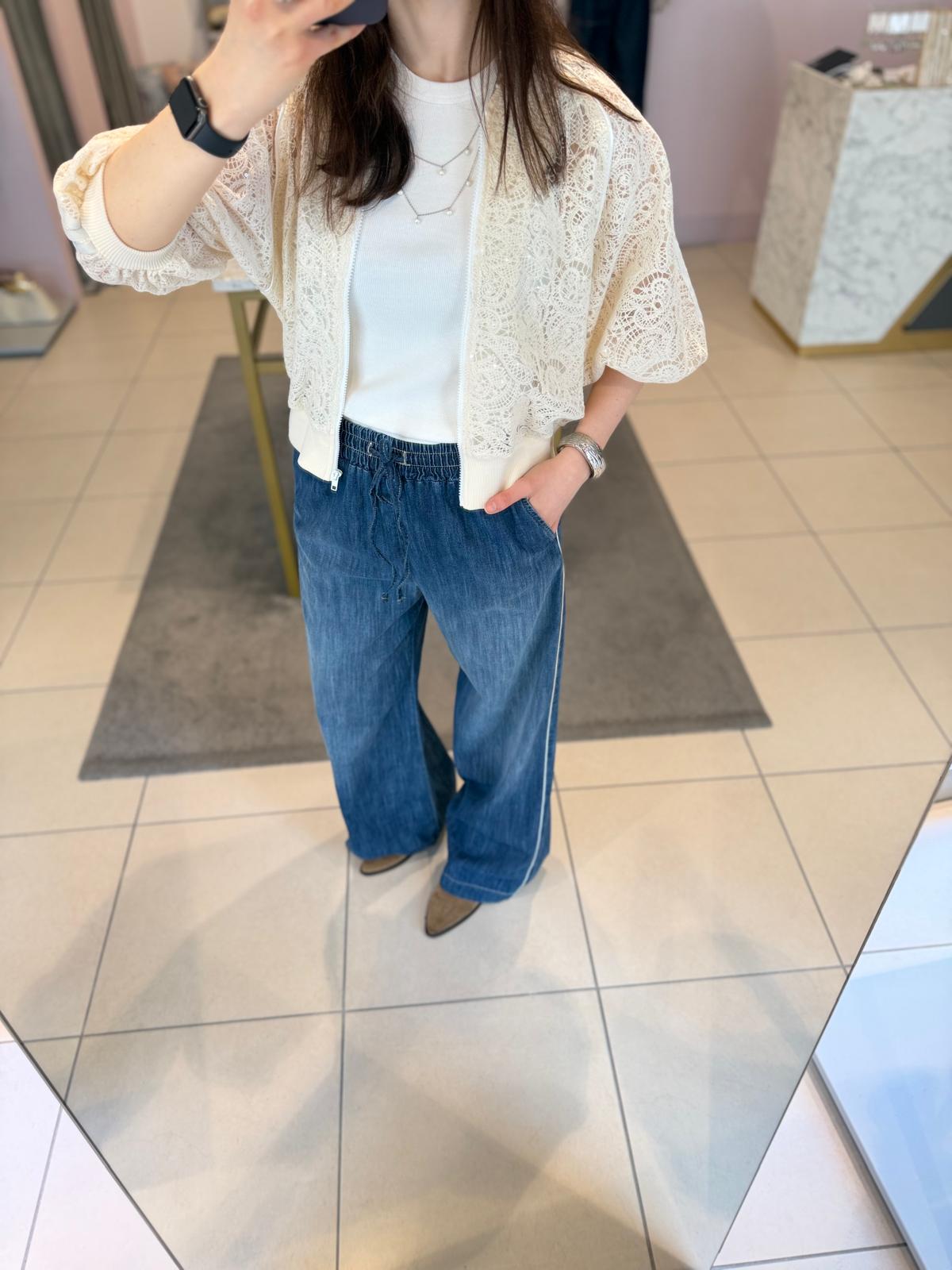 Bomber in pizzo con micropaillettes rifinito nei minimi dettagli, con bande laterali in raso sulle maniche.