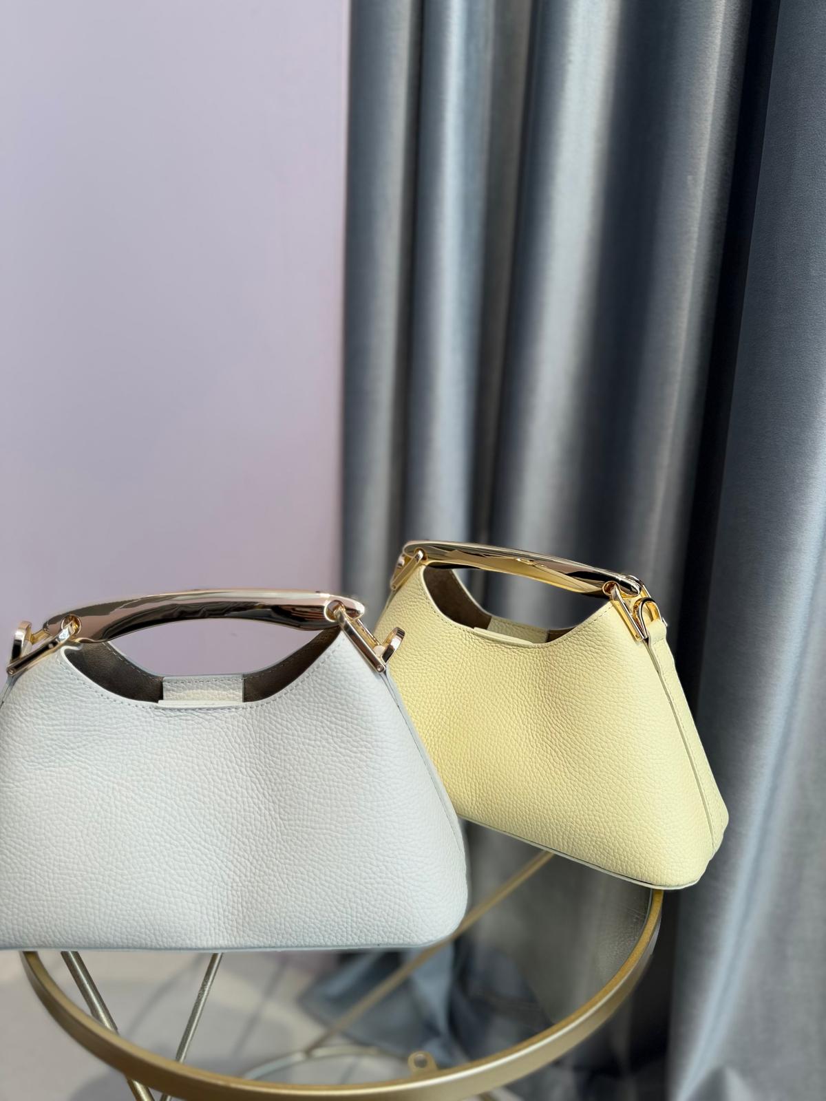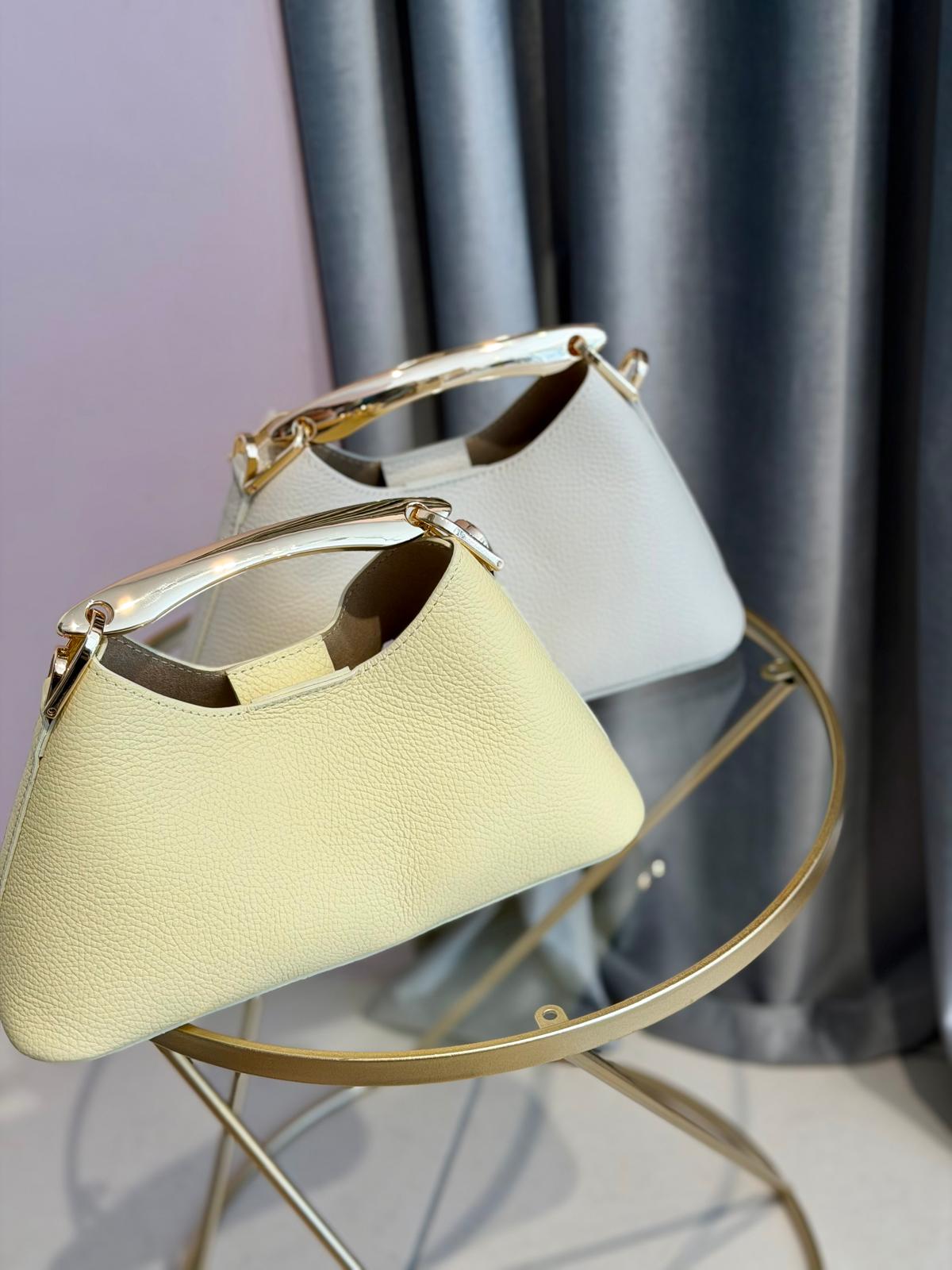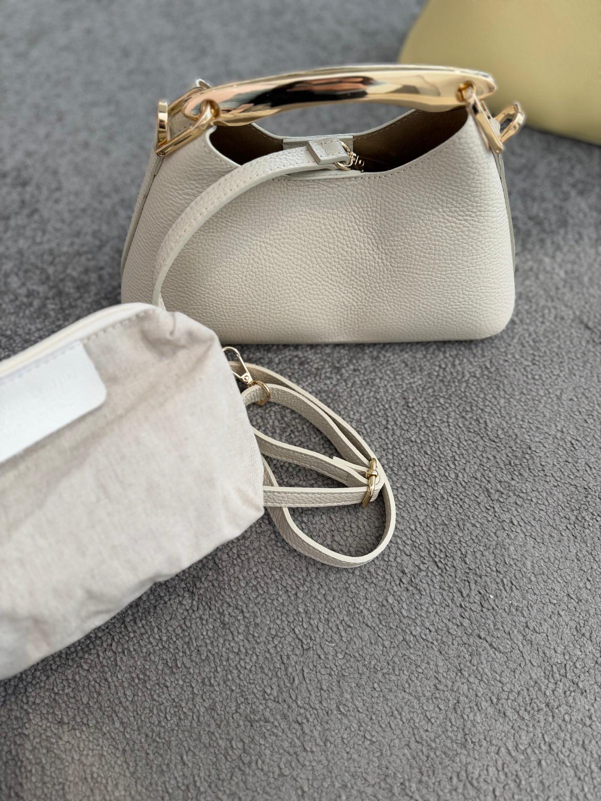 Borsa in vera pelle con manico dorato e tracollina regolabile in pelle.