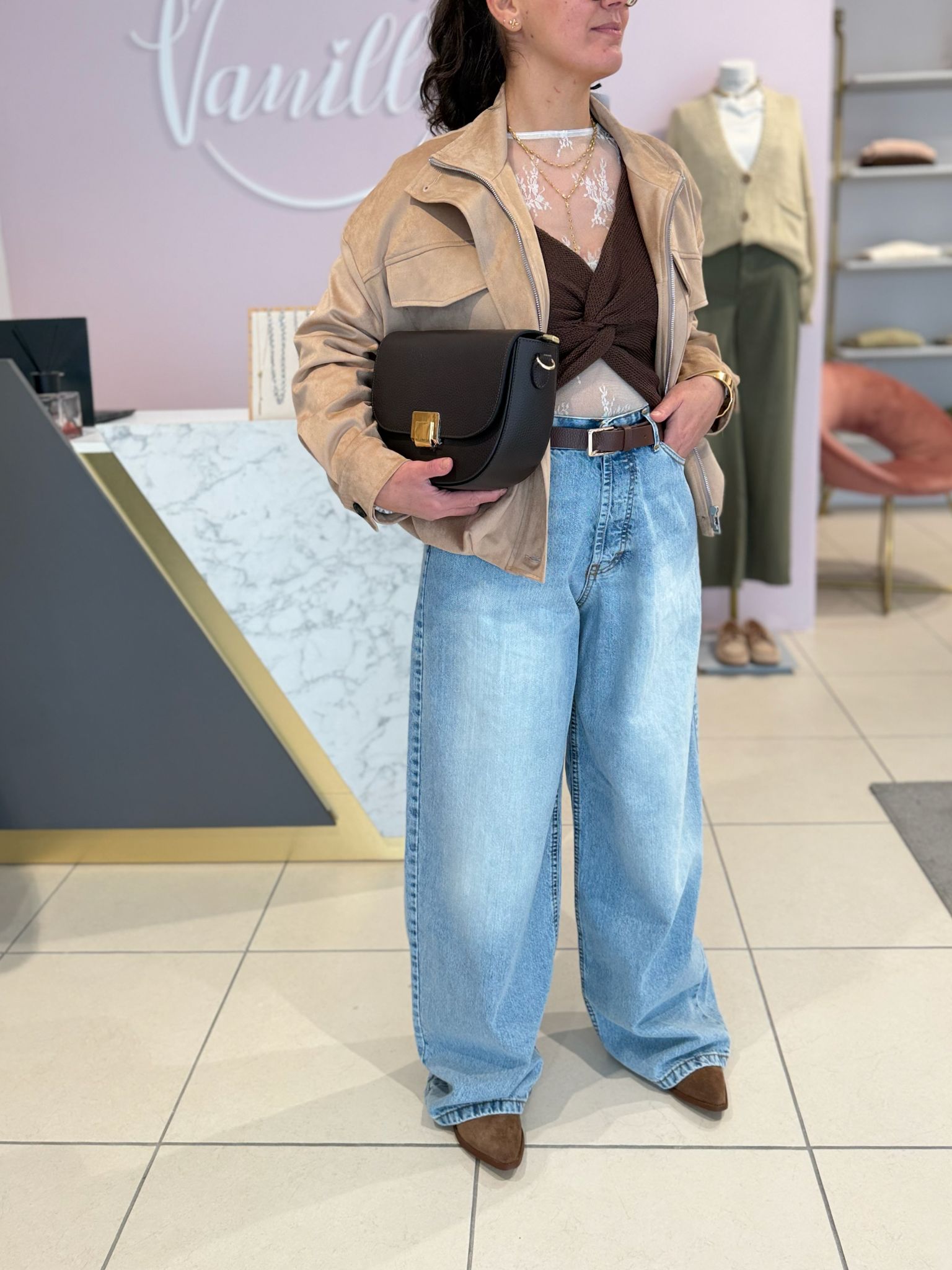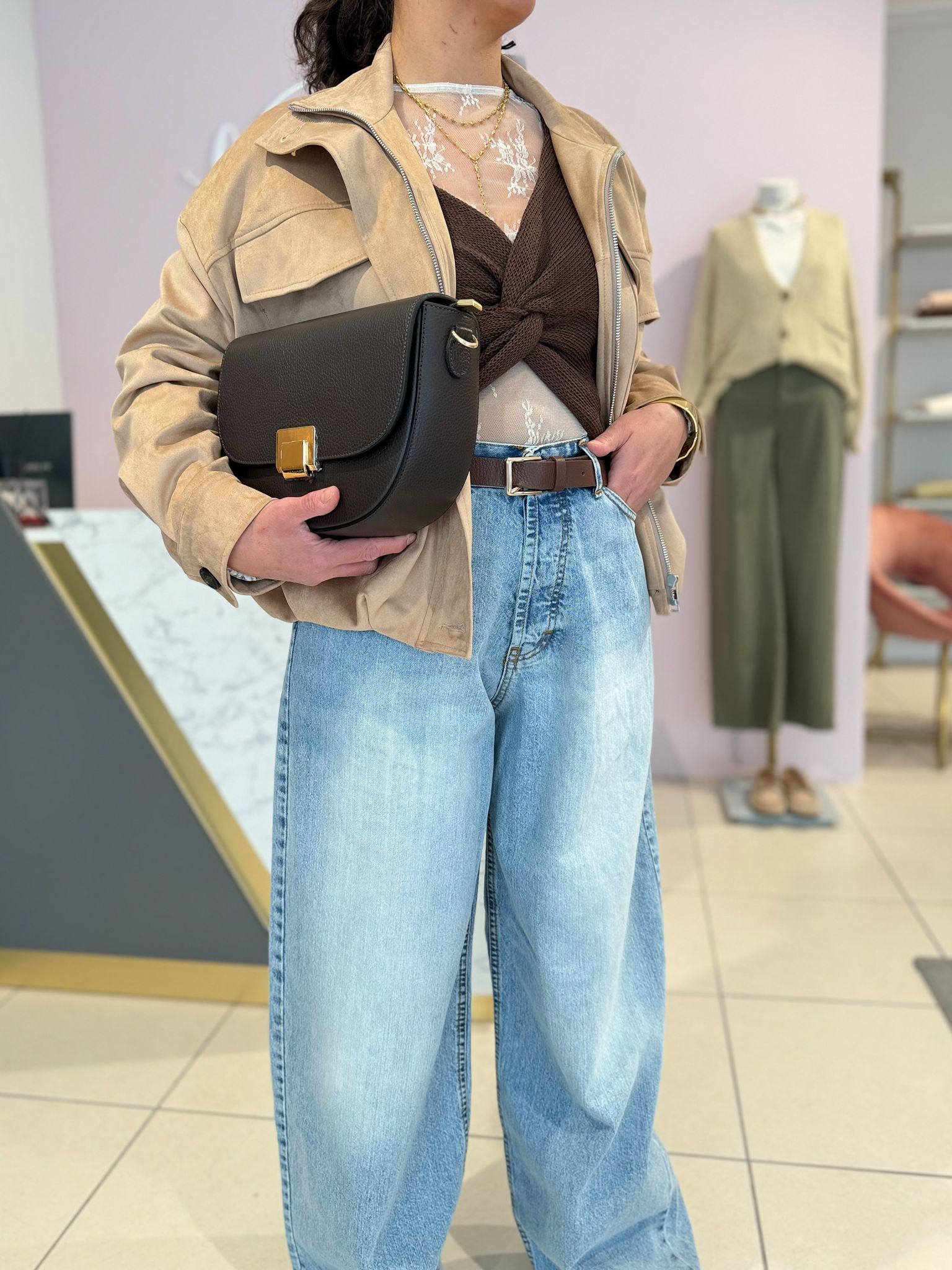 Doppia tracolla in pelle tono su tono (una per portarla a spalla e una più sottile a tracolla regolabile in lunghezza)