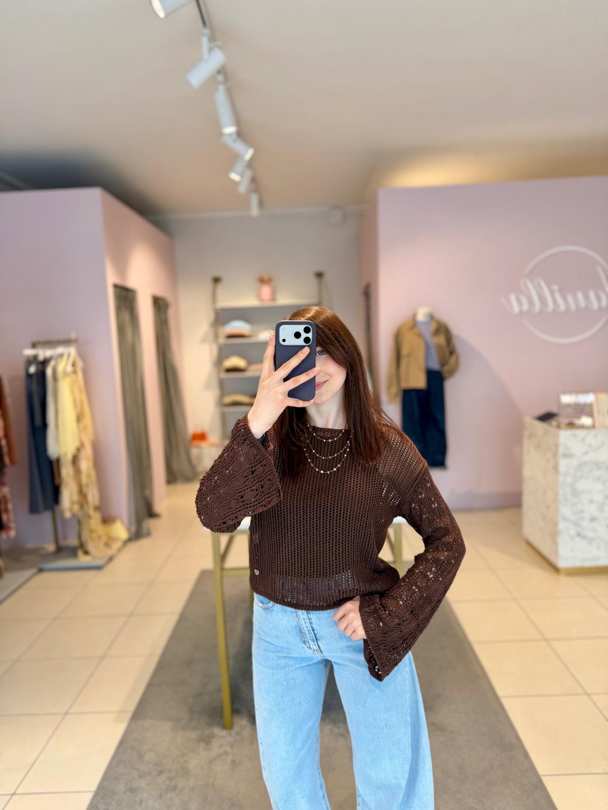 Maglia traforata in cotone, color cioccolato con manica a campana impreziosita da filo lurex dorato.