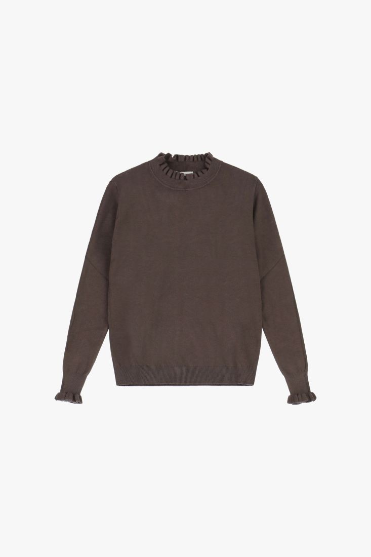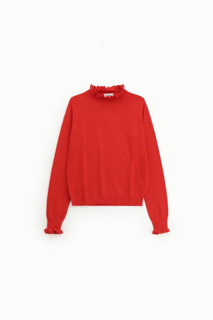 Maglioncino girocollo con maniche lunghe rifinite da delicati volant plissettati.